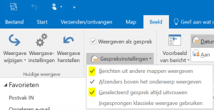 De laatste aanpassing die helpt bij het ordenen van e-mail is het weergeven van e-mail als gesprekken. Dit kan in Outlook makkelijk worden ingesteld via via het ribbon bij optie “Beeld”. Omdat e-mail verspreid over meerdere mappen kan staan zijn ook de optie “Geselecteerd gesprek altijd uitvouwen” en “Berichten uit andere mappen weergeven” te adviseren. Op die manier zie je van iedere e-mail die binnenkomt snel of er nog eerdere items in de map “Wachten op” staan en kun je die gemakkelijk verplaatsten naar “Archief”.