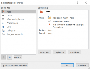 Zo heb ik de knop “Actie”, waarmee de geselecteerde e-mail verplaatst wordt naar de bijbehorende map “Actie”, wordt de e-mail gemarkeerd als gelezen en wordt deze gemarkeerd met een vlag zonder einddatum. En een knop “Done” die de e-mail archiveert. Enzovoorts.