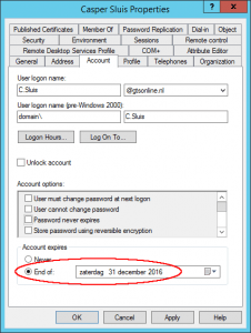 Als men via ‘Active Directory Users and Computers’ MMC Snap-in instelt dat het account verloopt op 31 december dan zal het object in PowerShell een verloopdatum teruggeven van 1 januari om 00:00:00. Als je bijvoorbeeld compliant moet zijn als het om licenties gaat is het dus interessant om het script voor middernacht te draaien en dan te controleren of het account morgen verlopen is, om het vervolgens gelijk te disablen: