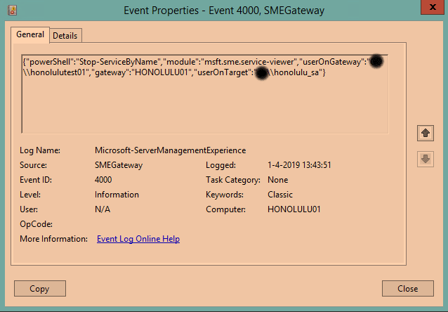 Naast beveiliging is natuurlijk auditing ook een belangrijk onderwerp. Over auditing is in WAC goed nagedacht en bevat bijna alle informatie die interessant is om te weten. De reden hiervoor is dat alles dat WAC uitvoert gedaan wordt met Powershel en/of WMI. Dit maakt het vrij gemakkelijk om de uitgevoerde acties in Eventviewer te plaatsen. De ervaring leert dat echter bij een aantal acties toch nog wat informatie miste in de auditing. Als voorbeeld, zodra een service werd gestopt of gestart was alles zichtbaar, behalve de naam van de service. Dit is wel vrij kritische informatie en de auditing is hierdoor niet toereikend. Hier is dan ook een melding van gemaakt richting Microsoft. De auditing van WAC kan overigens gevonden worden in Eventviewer onder de naam “Microsoft-ServerManagementExperience”.